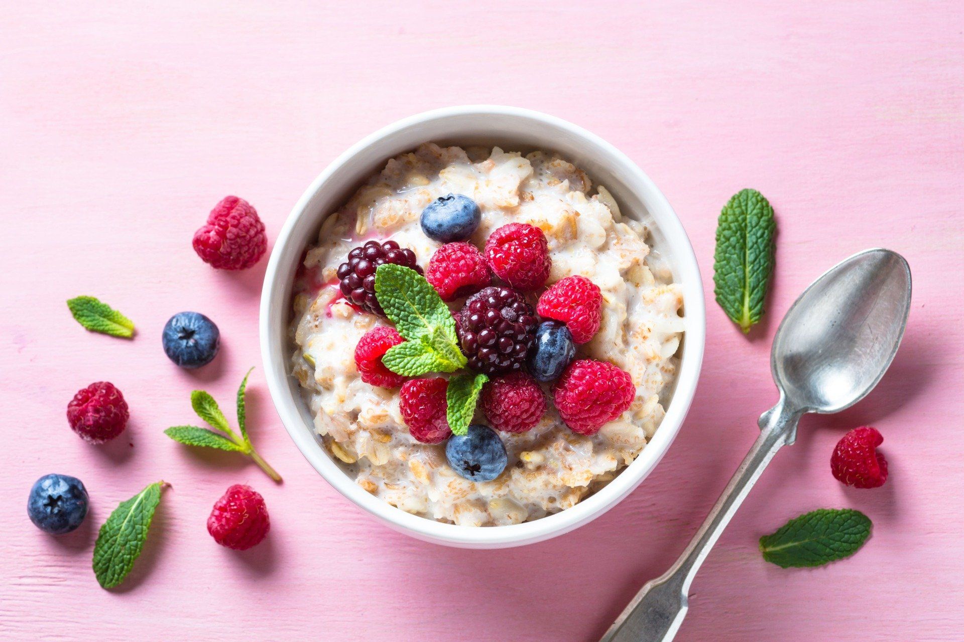 Oatmeal cereal with milk and berries top view. Von nadianb